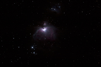 Gerade der Orionnebel erfordert bei der Fotografie eine spezielle Behandlung, die schon bei den Aufnahmen anfängt. Anders als zum Beispiel bei Galaxien, wo man möglichst viele langbelichtete Aufnahmen zusammen setzt, würde das beim Orionnebel nicht zu dem gewünschten Ergebnis führen. Um alle Regionen des Orionnebels möglichst detailliert abzulichten sind mindestens 3 verschieden lang belichtete Aufnahmeserien notwendig, besser wären sogar 4. Die 1. Serie sollte, je nach Öffnungsverhältnis und ISO-Einstellung, nur 10 bis 20 sec. belichtet werden, so dass das Trapez gut sichtbar ist. Bei der 2. Serie sollte das Trapez schon leicht überbelichtet sein, so das die Trapezsterne nicht mehr einzeln aufgelöst werden, aber die Nebelgebiete um das Trapez gut sichtbar sind. Die Aufnahmezeiten dürften hier bei ca. 30 bis 60 sec. liegen. Die 3. Serie sollte dann so lang belichtet sein, das die Schwingen des Orionnebels gut ausbelichtet sind. Die Aufnahmezeiten sollten bei ca. 4 bis 6 min liegen. Die 4. Serie sollte dann solang belichtet sein, das auch die Bucht unterhalb der Schwingen gut sichtbar ist. Die von mir vorgeschlagenen Belichtungszeiten beziehen sich natürlich auf das Fotografieren mit der Canon 300D bzw. der 10D.